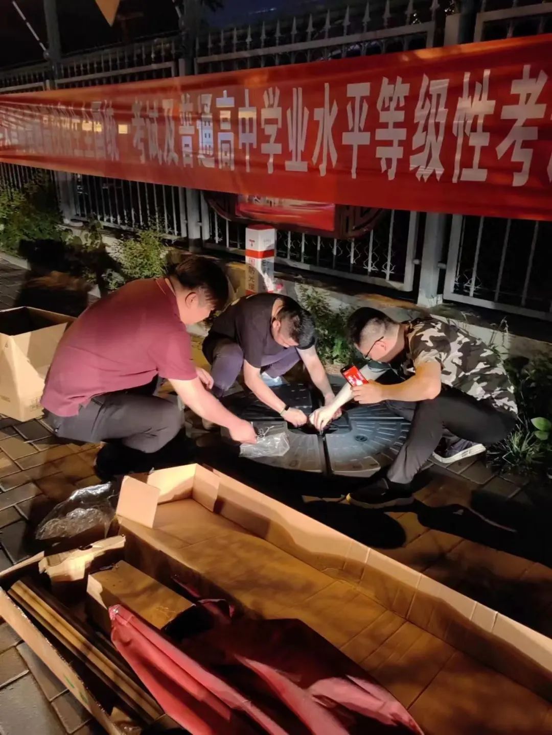 为了不影响考试当天考生及家长的备考状态,津药达仁堂的工作人员在高考前一天,奔赴市内六区连夜搭建爱心亭。