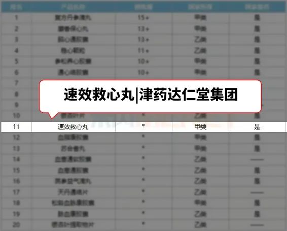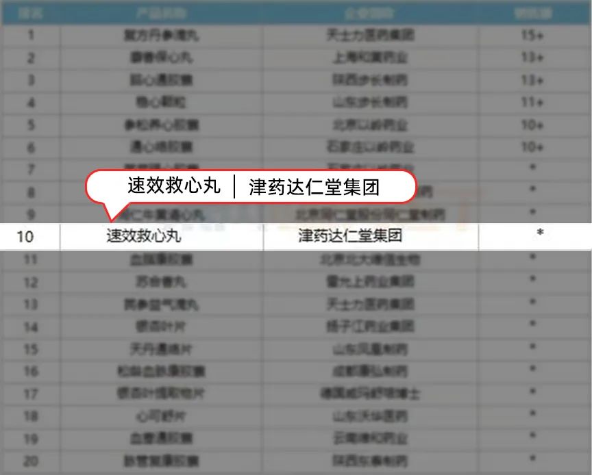 9个产品有双位数及以上增速,分别是苏合香丸(128.65%)、同仁牛黄清心丸(66.77%)、稳心颗粒(19.71%)、速效救心丸(15.30%)、天丹通络片(14.92%)、芪参益气滴丸(12.28%)、参松养心胶囊(11.19%)、芪苈强心胶囊(10.43%)、脑心通胶囊(10.15%),其中,苏合香丸凭借强劲的增速晋身TOP20。