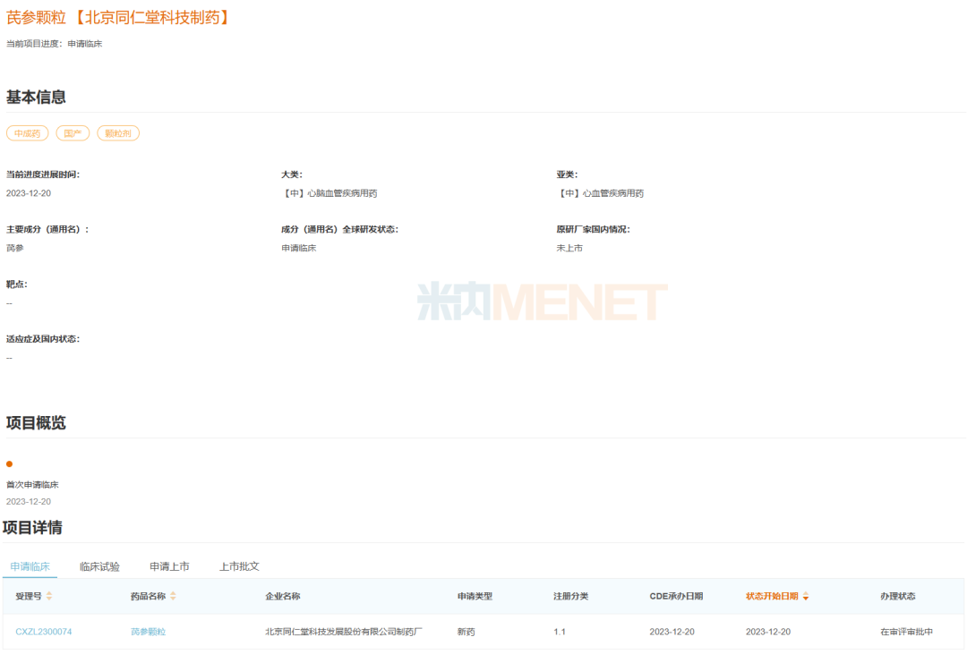 近日,北京同仁堂的中药1.1类新药芪参颗粒临床申请获CDE受理。该产品有益气活血、化瘀止痛功效,用于冠心病稳定型劳累型心绞痛I、II级,中医辩证属气虚血瘀证者,症见胸痛,胸闷,心悸气短,神疲乏力,面色紫暗,舌淡紫,脉弦而涩。